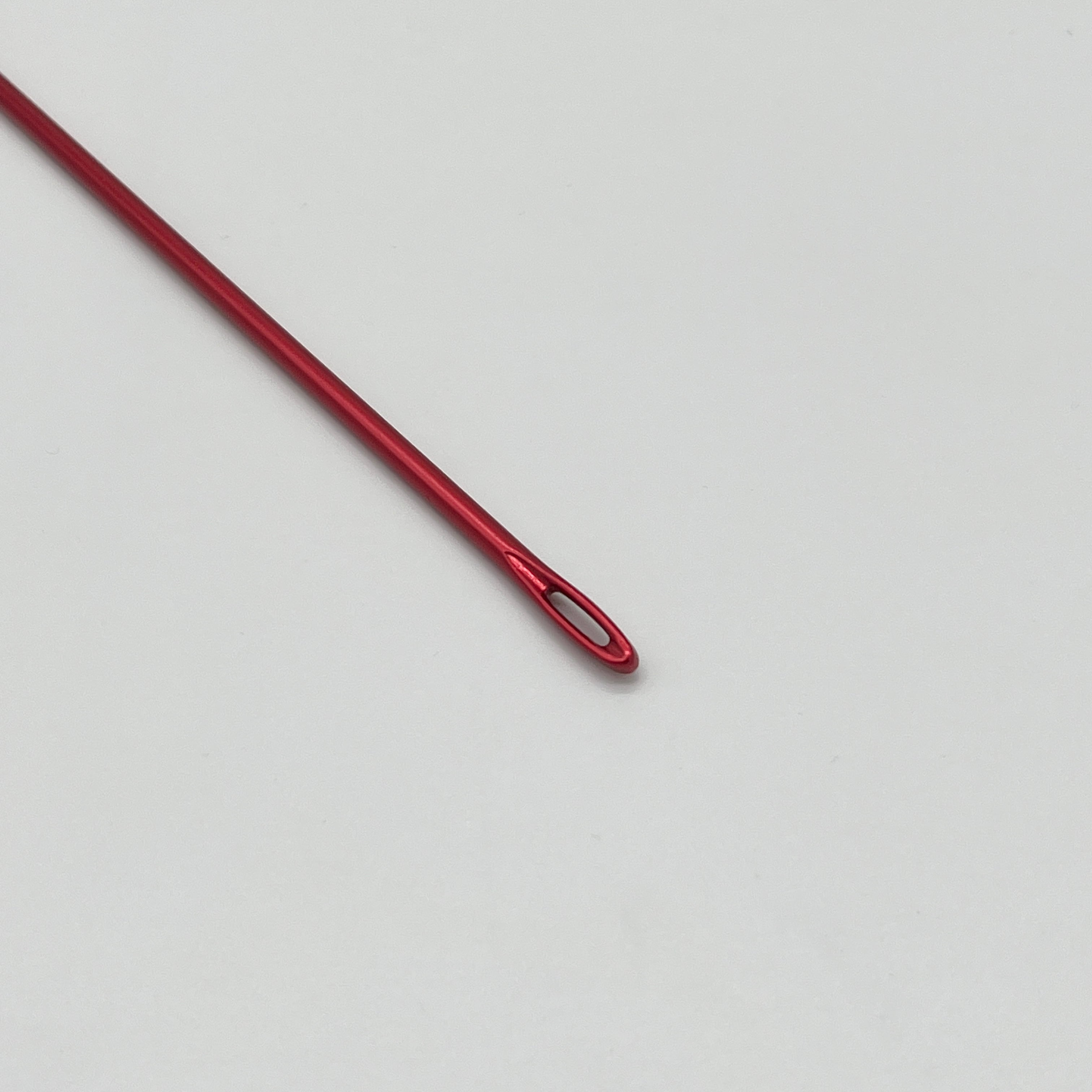 ロッカーフックは、針穴に芯紐を通し、先端のフック部分に糸を引っ掛けながらキャンバスの表に引き出して編み付けていく技法です。